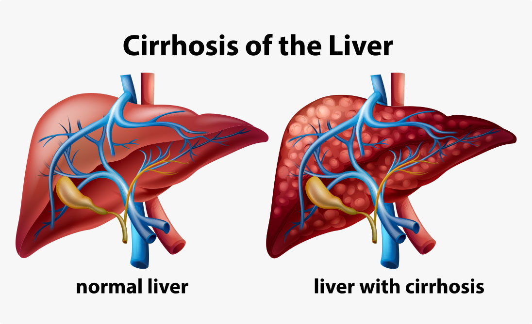 Liver cirrhosis occurs when healthy liver cells are replaced with scar tissue, preventing the liver from functioning properly. These scar tissues are formed as a result of long-term damage to the liver – excessive alcohol abuse, hepatitis B and C infection, or fatty liver from diabetes and obesity.